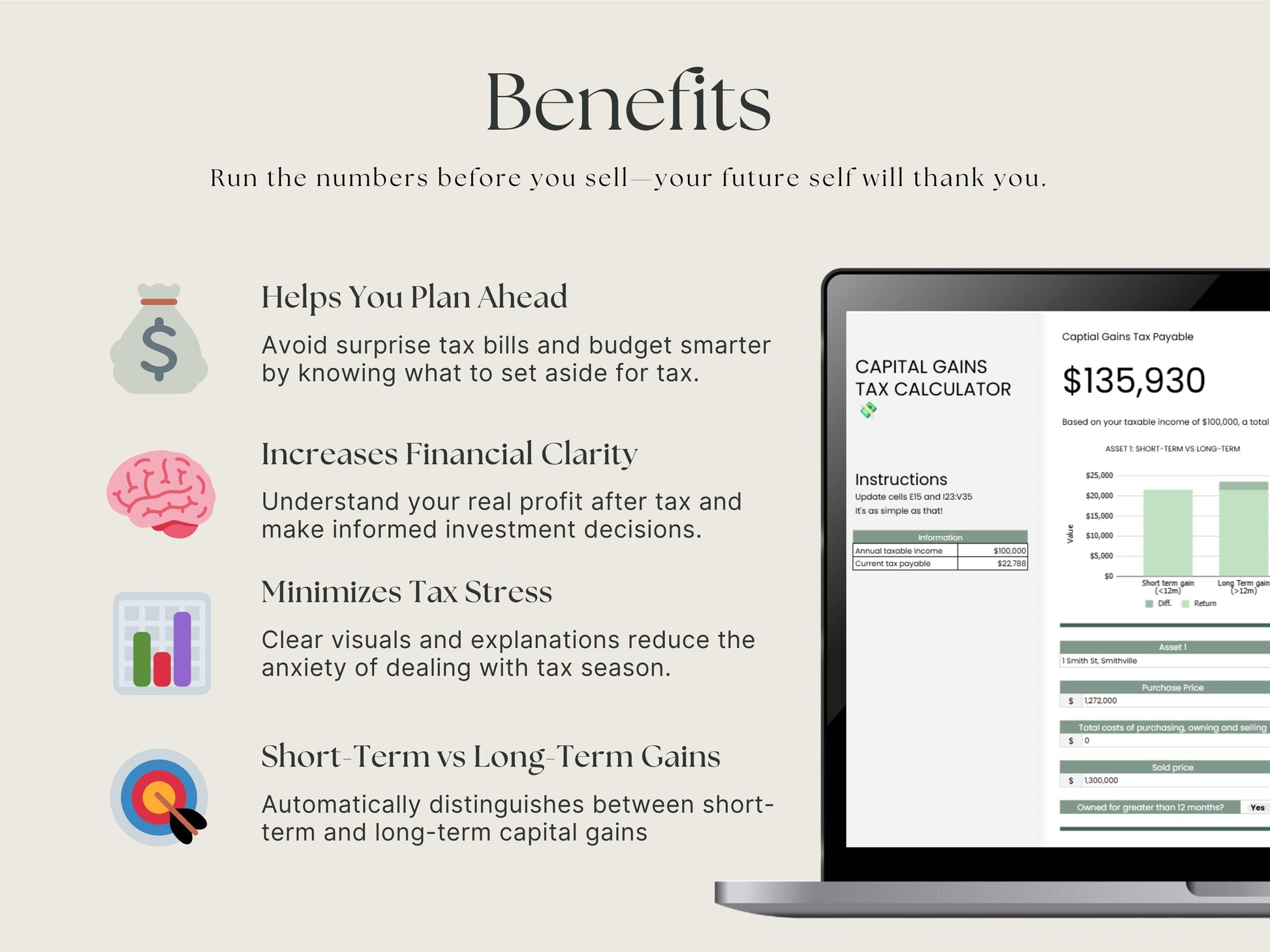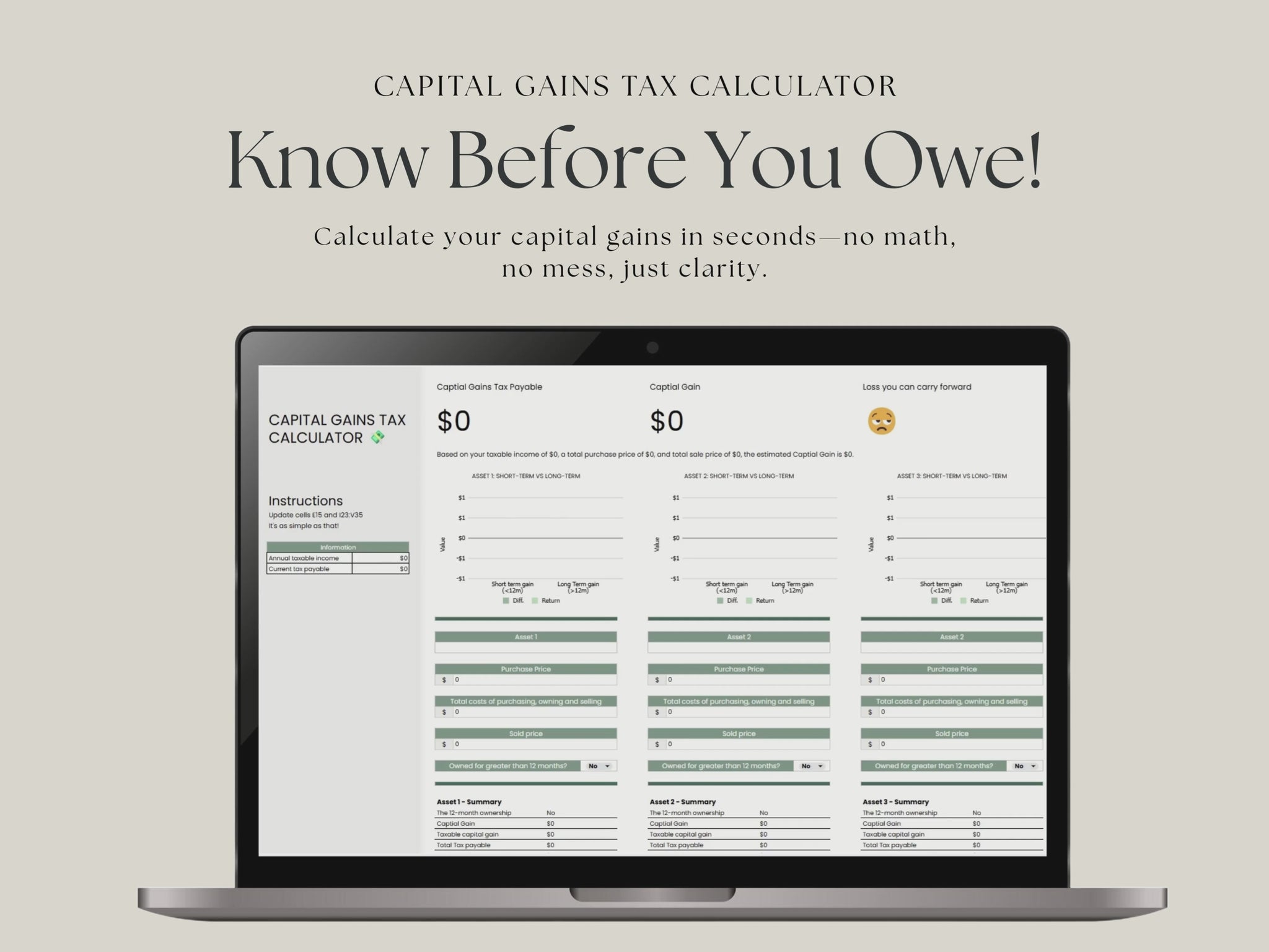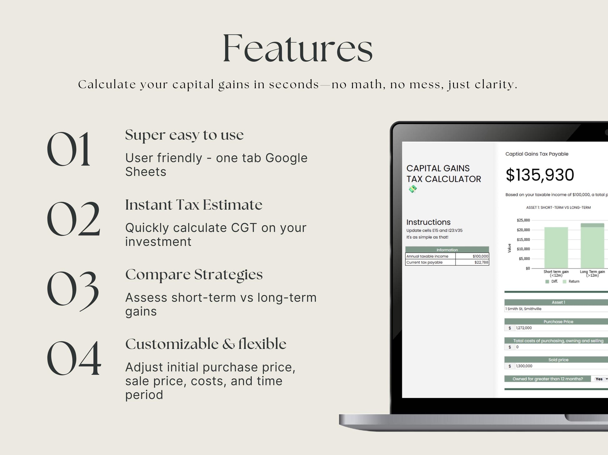 Enter your investment data and the sheet will instantly estimate your CGT payable. Designed for simplicity and accuracy with no tax jargon.