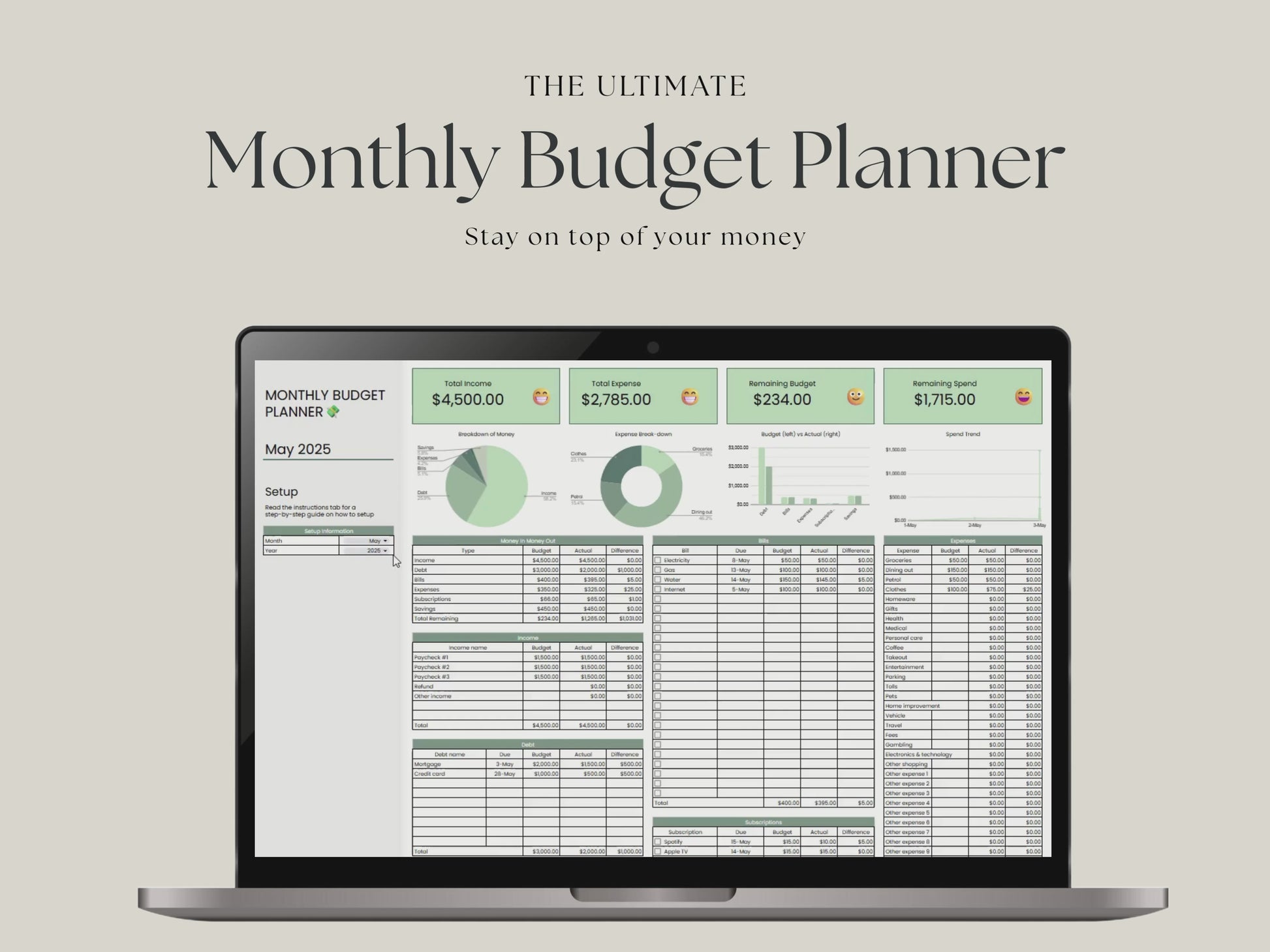 Stay on top of your money and feel in control with this easy-to-use monthly budget planner, built in Google Sheets.